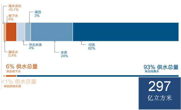 這30個樣本城市城區市政供水約有93%來自地表水源,每年約297億立方米。
