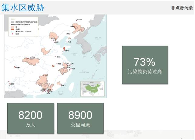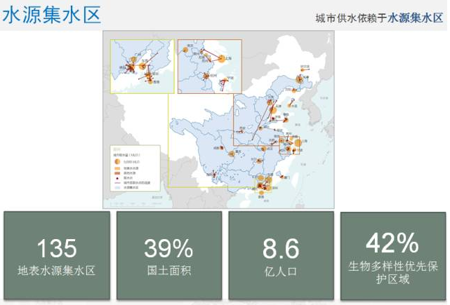 這些地表水源主要依賴135個地表水源集水區,集水區總面積達3.65億公頃,相當于我國國土陸域面積的39%。除了保障城市水供應之外,大約8.6億人的社會經濟狀況與這些水源集水區密切相關,同時,這些水源集水區覆蓋了42%的中國生物多樣性優先保護區域,以及一半的中國重點生態功能區。