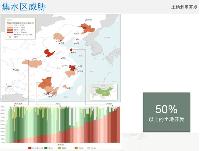 在三分之一的相對較小的地表水源集水區內,超過50%以上的土地被用于農業和城市建設的開發,土地的開發和退化給城市水源帶來了非點源污染的風險。