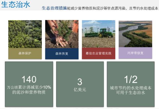 中國應對水資源挑戰的解決方案需要同時考慮自然生態系統和傳統工程措施。而投資水源保護地,加強對相關集水區河流、森林和農田的科學保護和管理,是積極應對城市用水壓力、防治水污染的重要舉措;在許多城市,水污染的預防通常比事后治理具有更高的成本效益。