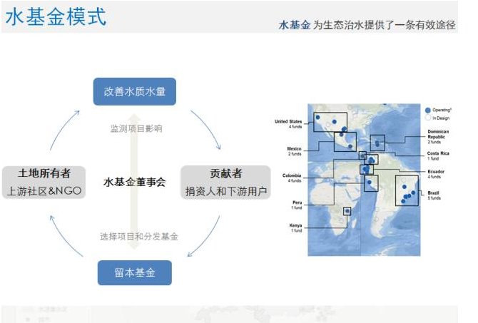 水基金是為了保護水源集水區,利益相關方成立的一種長效資金和管理機制,目前,水基金模式已在厄瓜多爾、巴西以及北美、非洲很多地方應用,并取得了成功的經驗。